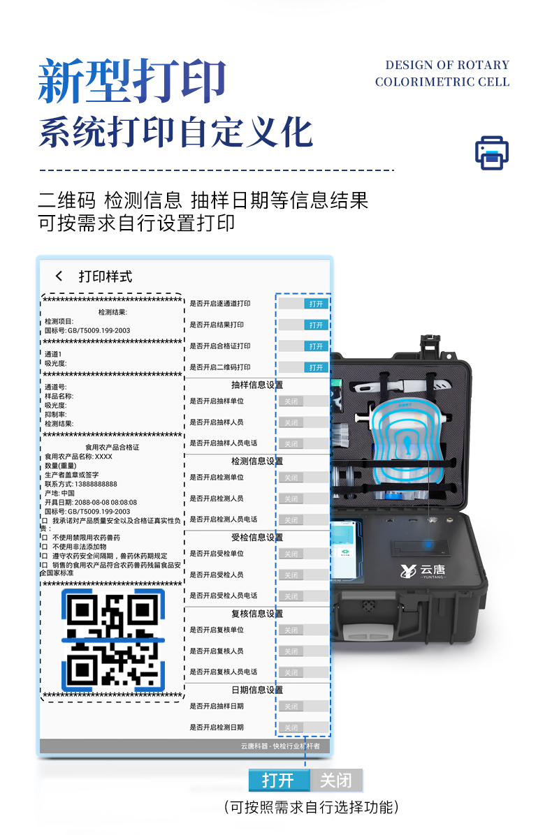 7、圖像調整功能:可根據金標卡讀取圖像進行多方位調整,使其更精準讀取結果。 | 8、儀器檢測系統擁有龐大數據庫,并且構建了完善的檢索、修訂功能。食品庫涵蓋多種樣品名稱,可按需添加或刪除、編輯樣品名稱;產品數據庫以及歷史檢測記錄支持一鍵檢索功能。 | 9、系統打印自定義化,打印格式多樣化,產品合格證(國家標準要求),二維碼,抽樣信息、檢測信息,受檢信息、復核信息、抽樣日期、檢測日期等信息結果,可按需求自行設置打印內容。 | 10、A4紙版本報告打印功能:設備擁有兩種結果展示方式,可以自動生成A4打印模板和小票打印模板兩種樣式,可通過WiFi及網線等方式鏈接外置打印機可進行打印 | 11、儀器具有 wifi 聯網上傳、RJ45網線連接功能,可以快速上傳數據。同步對接監管平臺,數據可局域網和互聯網數據上傳,檢測結果直接傳至食品安全監管平臺。進行區域食品安全監管及大數據分析處理與數據統計,檢測區域食品安全長短期動態,達到食品安全問題預估、預警。 | 12、設備支持U盤存儲,標準USB接口,免驅動安裝。檢測結果存儲容量20萬條以上,可生成Excel表格,進行一鍵拷貝,并具有登錄保護功能,可設置用戶名及密碼,規范不同人員操作權限,防止非工作人員操作,并且可以進行重新校準、鎖定、恢復出廠設置功能。儀器固件可升級,后期檢測項目可擴充。 | 13、儀器具備遠程升級功能,可定向分客戶分儀器更新,開機后自動更新,并可持續性免費更新系統版本,無需像傳統產品返廠更新,節省時間及人力成本并避免了物流運輸返廠升級導致設備損壞的潛在風險。 |