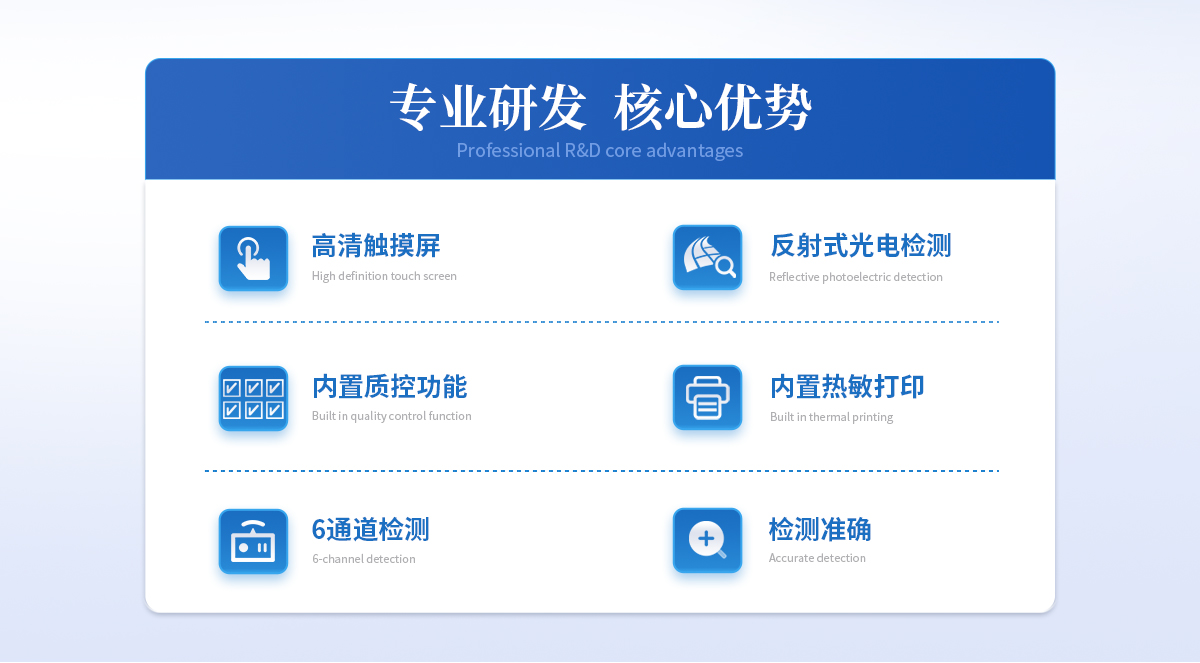 | 1、 ★Android觸控系統結合大尺寸高清屏幕,界面友好,操作簡單流暢,無需外接設備; | 2、 ★單卡+多聯卡設計方案,顯著提升檢測效率,滿足批量樣本快速處理需求; | 3、 可以500萬條檢測結果,支持按日期靈活查詢、預覽、刪除結果,并生成多樣化專業報告。 | 4、 內置熱敏打印機,檢測完成即可現場打印標準報告,提升工作效率。 | 5、 關鍵部件實時自診斷功能,保障儀器長期穩定運行。 | 6、 高速有線/無線網絡及藍牙,構建完善的數據監控平臺,實現數據實時上傳、遠程查詢、統計分析和監管協同。 | 7、 豐富的接口設計,輕松連接電腦、U盤、網絡及上位機系統,支持U盤導出。 | 8、★ 孵育模塊為特定試紙條反應提供**溫度環境。 | 9、 流線型結構,緊湊輕便,兼顧實驗室耐用性與檢測需求。 | 10、 二維碼掃描錄入樣本信息,避免人工錯誤。 | 11、★ 插卡判斷:檢測卡未插入檢測通道不能內置質控功能,可設備送檢、設備自檢、試劑卡自檢測方式:孵育檢測、即時檢測(對檢測數據復檢核實) | 12、 檢測曲線:可以對試劑卡的檢測核驗,防止誤判 | 13、★ 檢測結果:報告出檢測項目、被測物質的濃度、檢測單位、被檢查單位、檢驗員、檢測時間、檢測限等信息可在觸摸屏上顯示,可通過儀器內置打印機輸出 | 14、 項目管理:支持檢測項目拓展功能 | 15、 界面設置:可修改標題和頁尾信息,靈活展示儀器信息 |