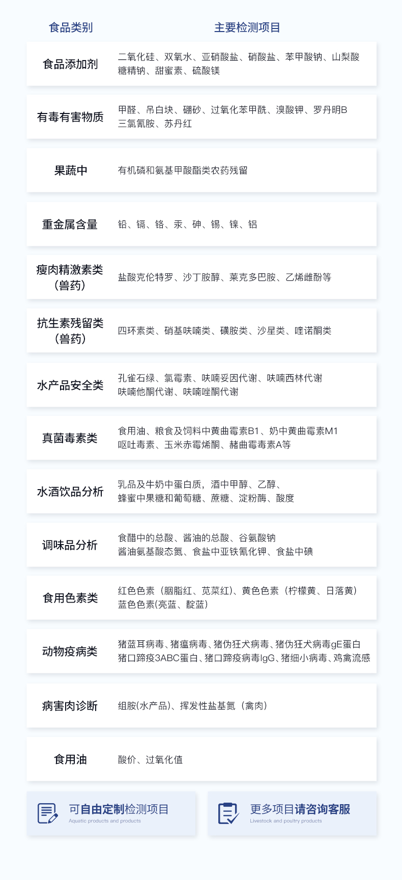 可快速檢測各類食品中的甲醛、二氧化硫、亞硝酸鹽的含量,儀器預留其他項目檢測程序和端口,根據日后需求可方便的自主增加檢測項目。