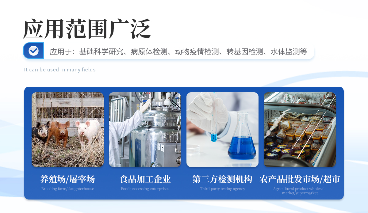 該獸藥殘留檢測儀適用于豬、雞、鴨、羊、牛、牛奶等畜禽肉產(chǎn)品中獸藥殘留,包括抗生素類殘留、瘦肉精激素類殘留和水產(chǎn)品有毒有害物質(zhì)的現(xiàn)場快速篩查定及定性定量檢測。 該多功能獸藥殘留檢測儀為集成化肉品安全快速檢測分析設(shè)備,可廣泛應(yīng)用于畜牧養(yǎng)殖場、屠宰場、食品肉產(chǎn)品深加工企業(yè)、食藥監(jiān)局、檢驗檢疫部門、衛(wèi)生部門、高教院校、科研院所、農(nóng)業(yè)部門等單位使用。