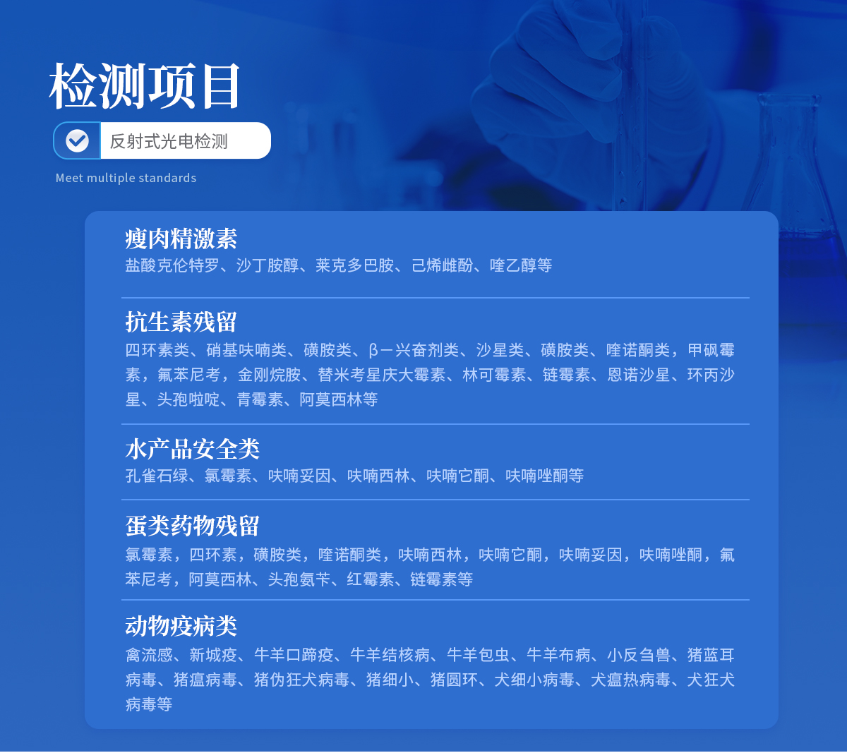 | 1、瘦肉精激素:鹽酸克倫特羅、沙丁胺醇、萊克多巴胺、己烯雌酚、喹乙醇等 | 2、 抗生素殘留:四環(huán)素類、硝基呋喃類、磺胺類、β-興奮劑類、沙星類、磺胺類、喹諾酮類,甲砜霉素,氟苯尼考,金剛烷胺、替米考星、慶大霉素、林可霉素、鏈霉素、恩諾沙星、環(huán)丙沙星、頭孢啦啶、青霉素、阿莫西林等 | 3、 水產(chǎn)品安全類:孔雀石綠、氯霉素、呋喃妥因、呋喃西林、呋喃它酮、呋喃唑酮等 | 4、蛋類藥物殘留 氯霉素,四環(huán)素,磺胺類,喹諾酮類,呋喃西林,呋喃它酮,呋喃妥因,呋喃唑酮,氟苯尼考,阿莫西林、頭孢氨芐、紅霉素、鏈霉素等 | 5、 動物疫病類:禽流感、新城疫、牛羊口蹄疫、牛羊結(jié)核病、牛羊包蟲、牛羊布病、小反芻獸、豬藍(lán)耳病毒、豬瘟病毒、豬偽狂犬病毒、豬細(xì)小、豬圓環(huán)、犬細(xì)小病毒、犬瘟熱病毒、犬狂犬病毒等 |