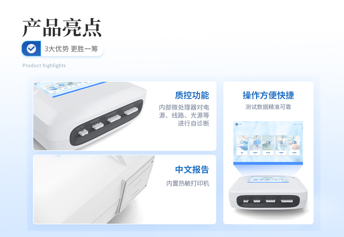| 1、 手持式設(shè)計,電池供電,緊湊輕便,兼顧移動檢測需求 | 2、 Android4.4系統(tǒng),界面友好,操作簡單流暢,無需外接設(shè)備; | 3、 8G超大容量內(nèi)存,支持按日期靈活查詢、預(yù)覽、刪除結(jié)果,并生成多樣化專業(yè)報告。 | 4、 高精度光學(xué)系統(tǒng):采用特定波長光源和光電傳感器,減少環(huán)境光干擾。 | 5、 二維碼掃描錄入樣本信息,避免人工錯誤 | 6、 內(nèi)置熱敏打印機(jī),檢測完成即可現(xiàn)場打印標(biāo)準(zhǔn)報告,提升工作效率。 | 7、 關(guān)鍵部件實時自診斷功能,保障儀器長期穩(wěn)定運行。 | 8、 無線網(wǎng)絡(luò)及藍(lán)牙,構(gòu)建完善的數(shù)據(jù)監(jiān)控平臺,實現(xiàn)數(shù)據(jù)實時上傳、遠(yuǎn)程查詢、統(tǒng)計分析和監(jiān)管協(xié)同。 | 9、 通道內(nèi)置孵育模塊,為特定試紙條反應(yīng)提供**溫度環(huán)境。 | 10、 支持多種品牌/類型的金標(biāo)試紙條 | 1、 插卡判斷:檢測卡未插入檢測通道不能檢測 | 11、 內(nèi)置質(zhì)控功能,可設(shè)備送檢、設(shè)備自檢、試劑卡自檢 | 12、 檢測方式:孵育檢測、即時檢測(對檢測數(shù)據(jù)復(fù)檢核實) | 13、 檢測曲線:可以對試劑卡的檢測核驗,防止誤判。 | 14、 檢測結(jié)果:報告出檢測項目、被測物質(zhì)的結(jié)果、檢測單位、被檢查單位、檢驗員、檢測時間、檢測限等信息可在觸摸屏上顯示,可通過儀器內(nèi)置打印機(jī)輸出 | 15、 項目管理:支持項目拓展 | 16、 界面設(shè)置:可修改標(biāo)題和頁尾信息,靈活展示儀器信息 |