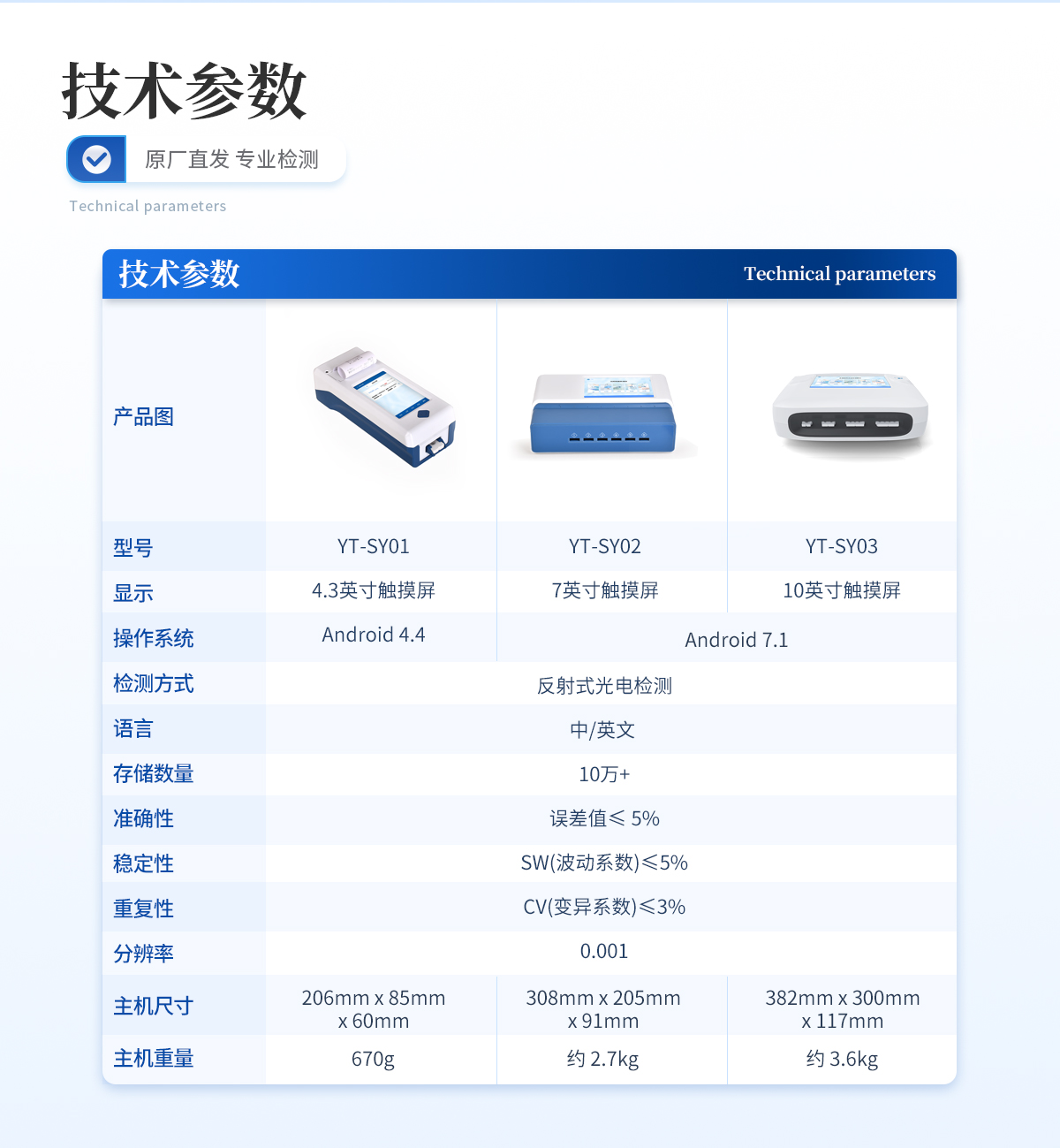 | 2、 屏幕:4.3英寸觸摸屏,分辨率:800*480,內(nèi)部存儲:1+8GB | 3、 操作系統(tǒng):Android:4.4 | 4、 檢測方式:反射式光電檢測 | 5、 適配卡殼:70mm*20mm | 6、 語言:中/英文: | 7、 存儲數(shù)量:10萬+ | 8、 準(zhǔn)確性:誤差值≤:5% | 9、 穩(wěn)定性:SW(波動系數(shù))≤:5% | 10、重復(fù)性:CV(變異系數(shù))≤:3% | 11、分辨率:0.001 | 12、檢測通道:單通道 | 13、檢測時間:<:5秒;可對樣本進(jìn)行膠體金定性> | 14、數(shù)據(jù)傳輸:WiFi、藍(lán)牙、Type-C | 15、數(shù)據(jù)處理:可通過通訊端口進(jìn)行數(shù)據(jù)匯總、上傳監(jiān)管平臺等 | 16、檢測通道孵育檢測一體,溫度范圍::室溫:+5℃:~:60℃ | 17、打印機(jī):熱敏打印機(jī)(熱敏打印紙:57*20mm) | 18、電源:輸入AC100V-240V/0.3A 50Hz;輸出DC5V/2A | 19、電池容量:6000mah: | 20、顯示電量 | 21、使用環(huán)境:溫度:0~50℃;濕度:0~90%: | 22、主機(jī)尺寸::206mm*85mm*60mm | 23、主機(jī)重量:670g |
